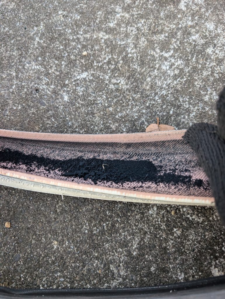 タイヤの内側もガサガサになり、チューブのカスもすごいです。
