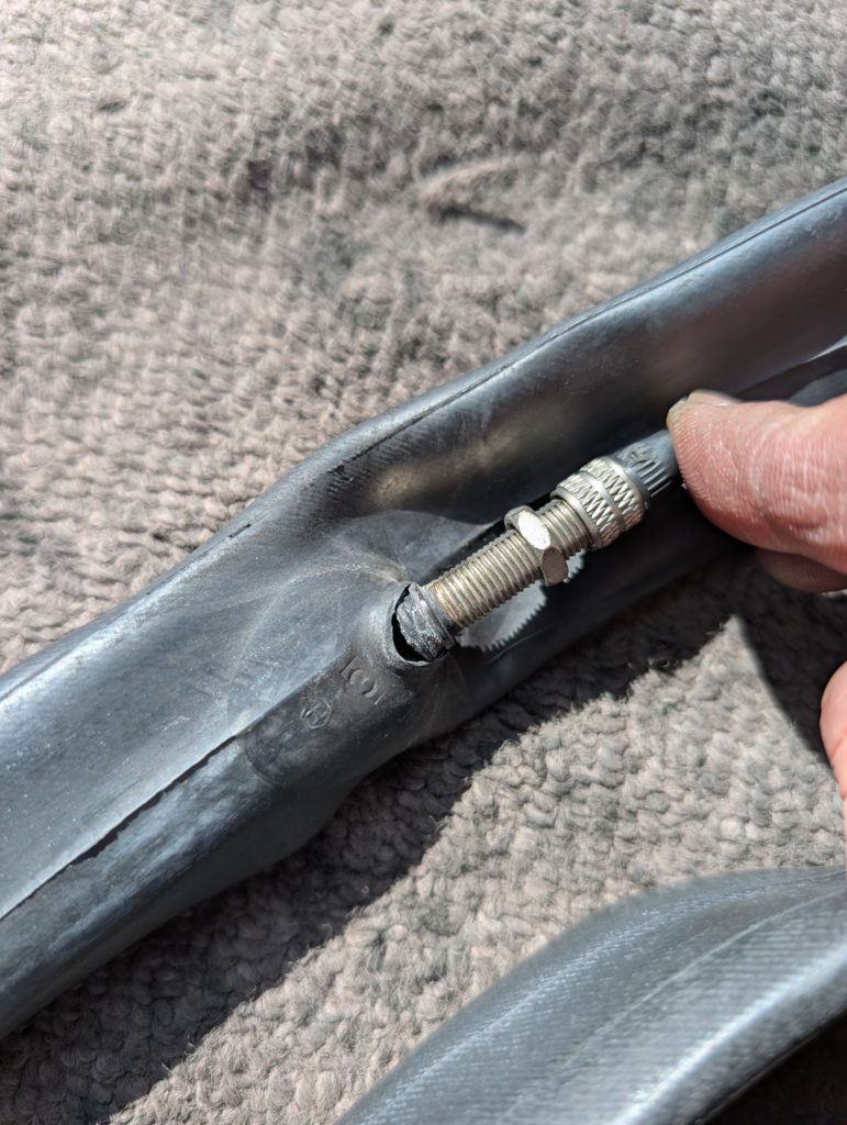 空気が少なくチューブがズレて、バルブが引っ張られて割れます。