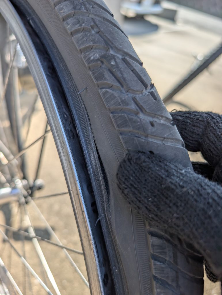 ブレーキシューがタイヤに擦れ、タイヤが切れています。