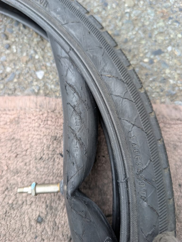 タイヤの損傷がチューブにも同じように跡が付いています。