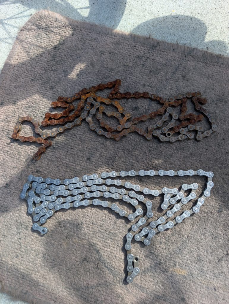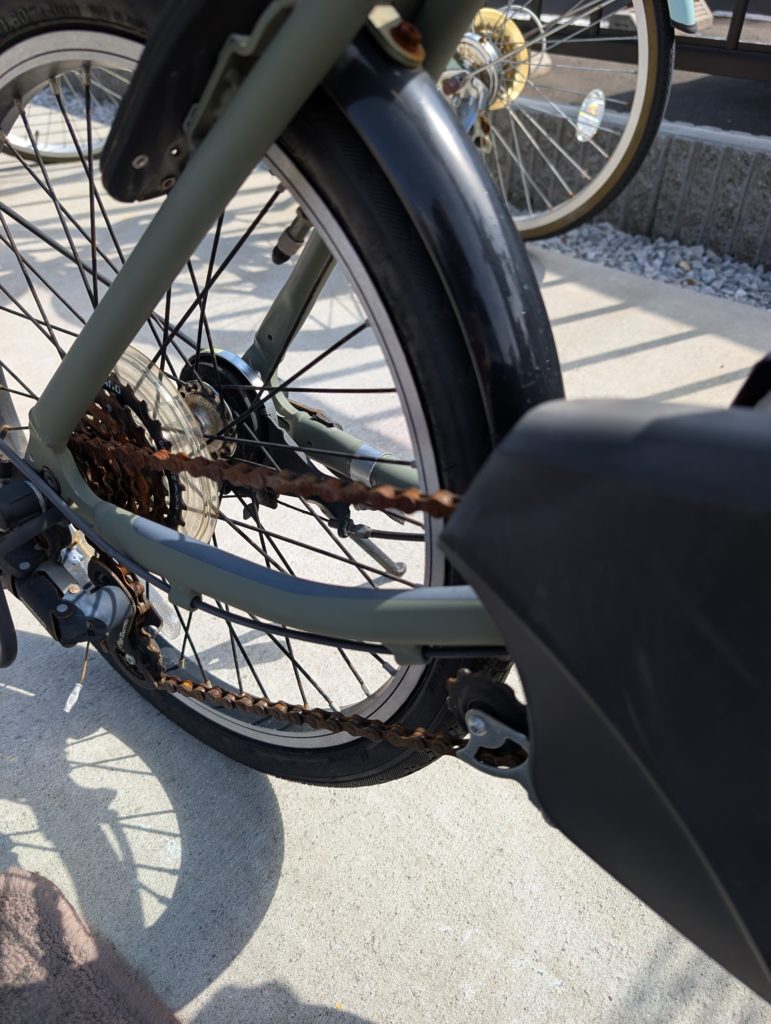 電動アシストでも外装変速のチェーンは、雨ざらしにするとすぐに錆びます。