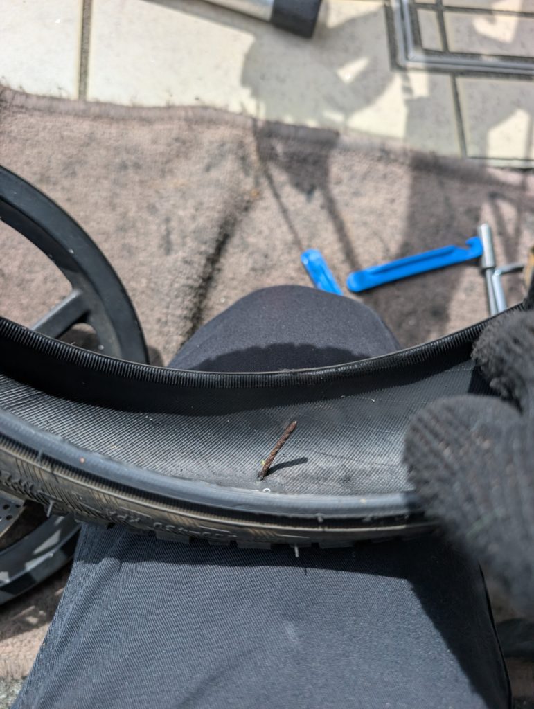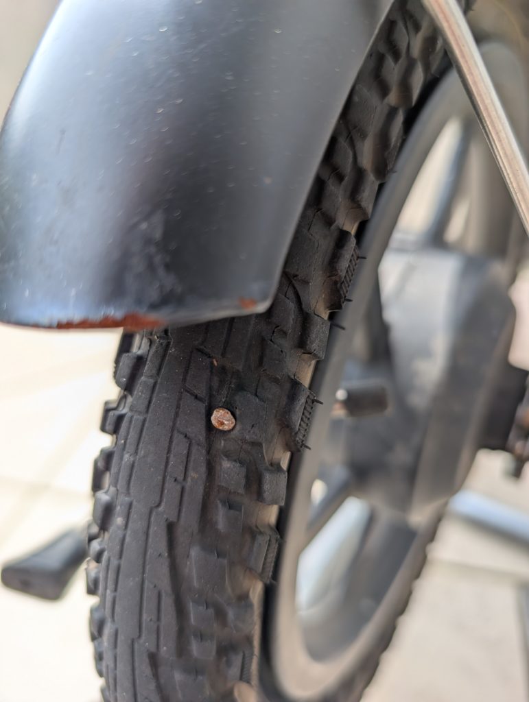 タイヤに何かが刺さっています。