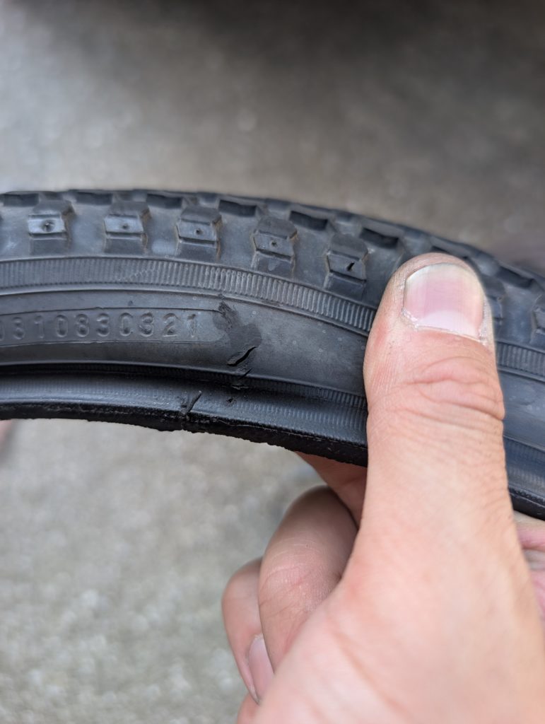 タイヤを見ると、サイドが切れています。